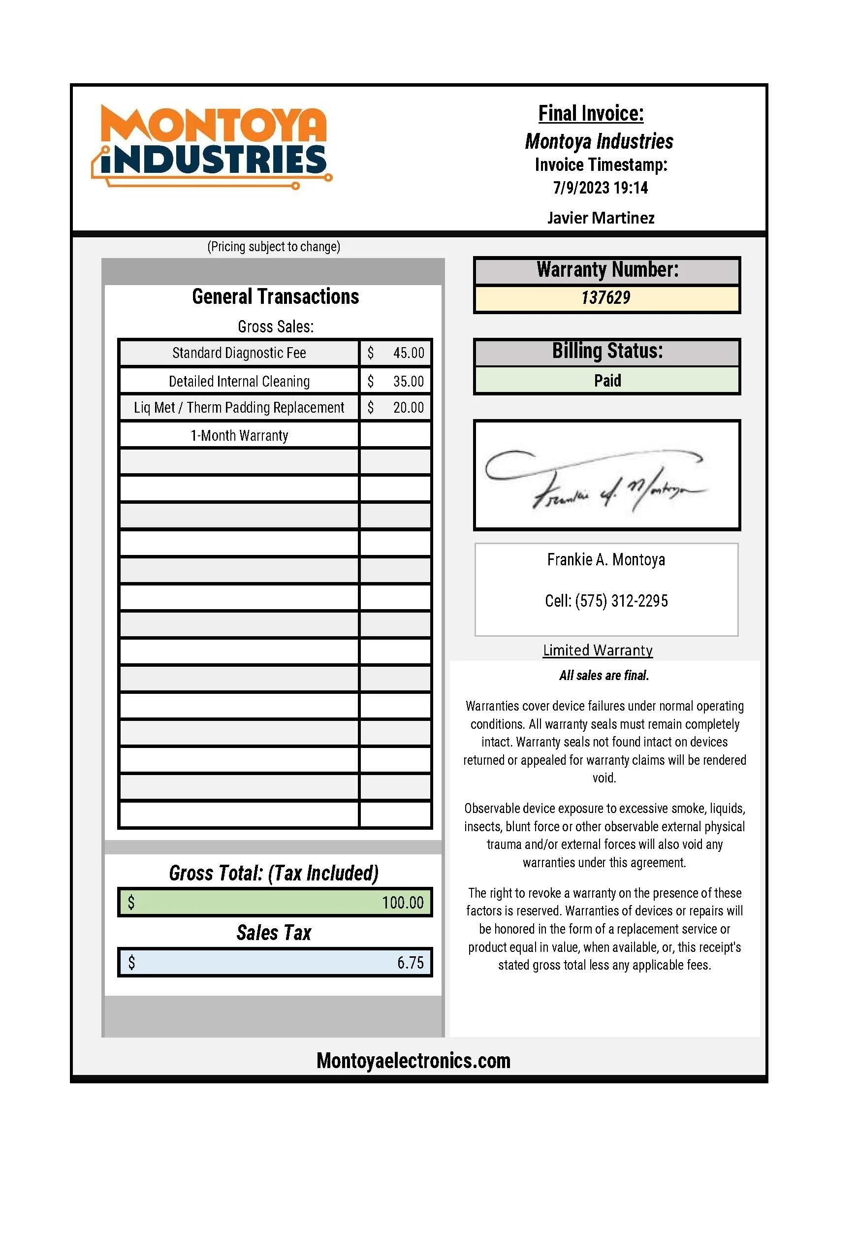 New liquid metal and thermal padding were added to the cleaned system. $100 will be due at pickup and can be paid with cash or through the online webstore (by request).